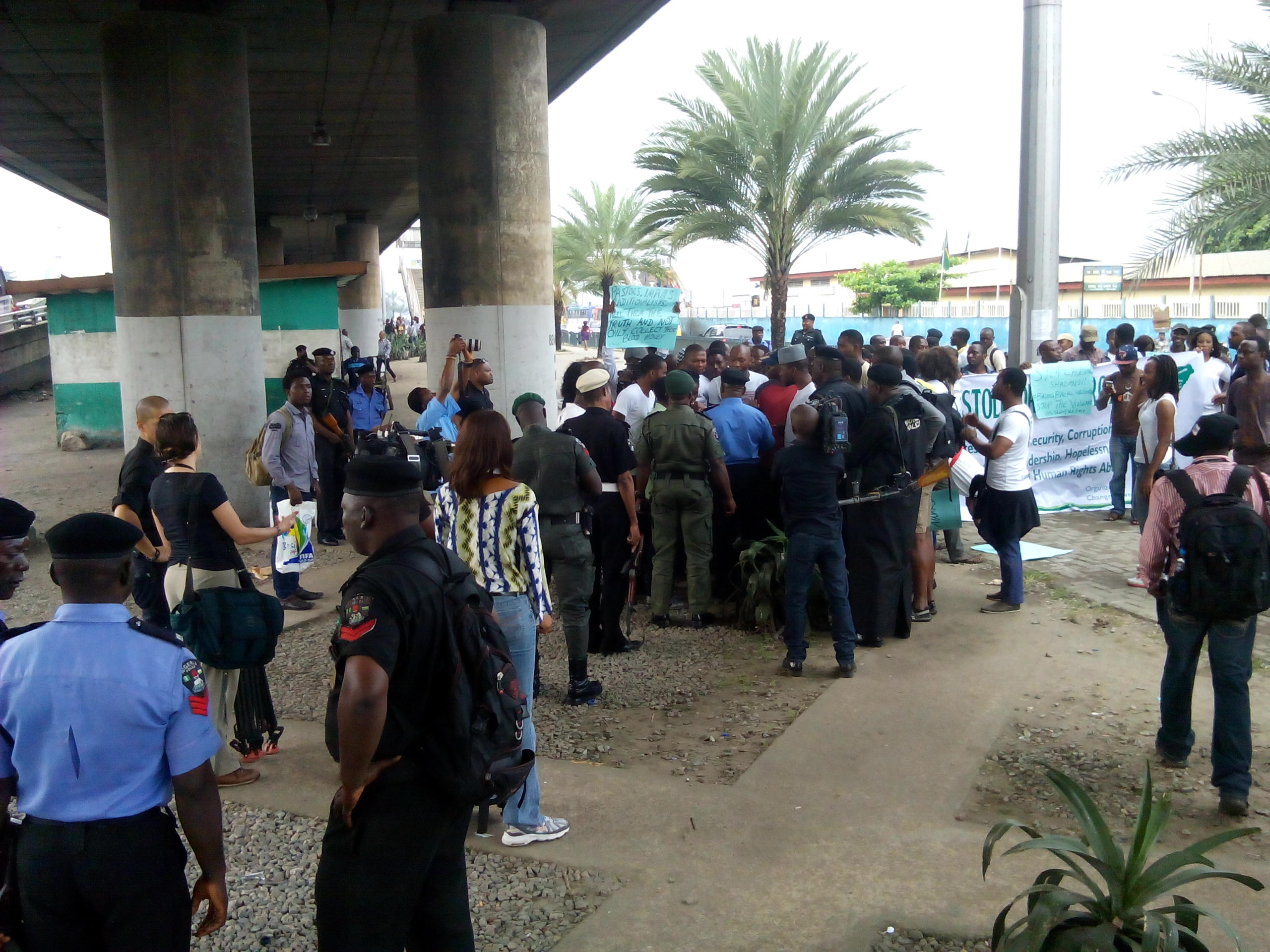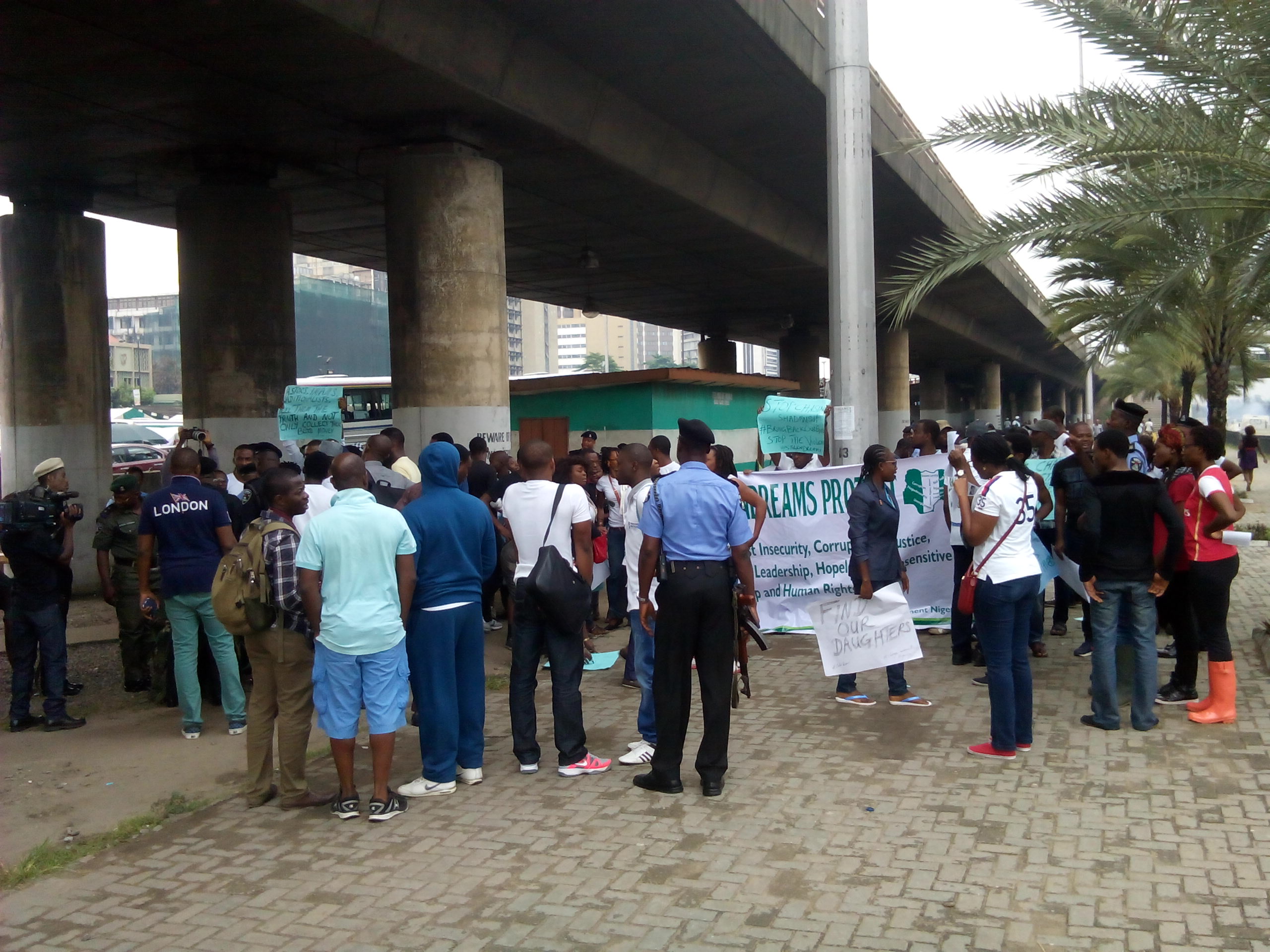 There was a mild drama in Lagos between the police and a group of concerned Nigerians protesting against the abduction of female students writing exams at the Government Girls Secondary School, Chibok, Borno State.